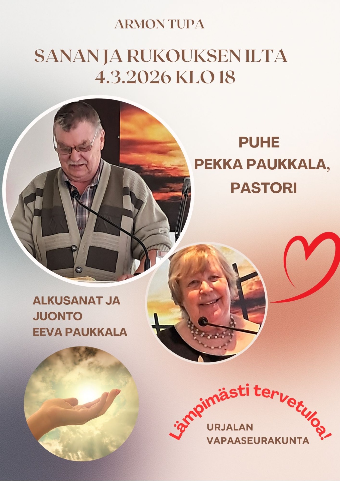 Sanan ja rukouksen ilta kokoaa yhteen rauhoittumaan, kuuntelemaan ja kohtaamaan Jumalaa arjen keskellä. Illassa lauletaan yhdessä, pysähdytään Raamatun äärelle ja jätetään omat sekä yhteiset rukousaiheet Jumalan käsiin.