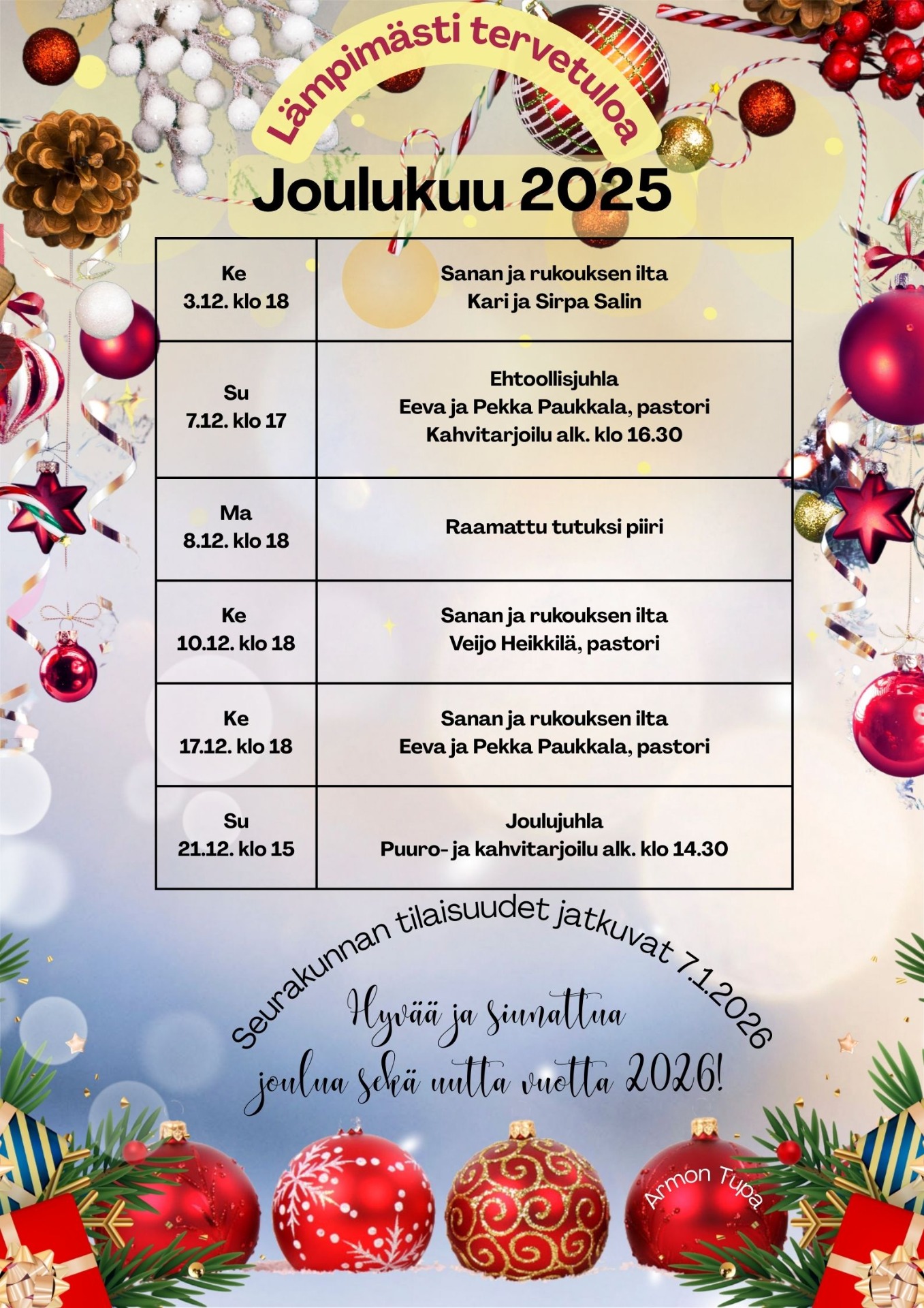 Meillä on ilo kutsua sinut mukaan tilaisuuksiimme, joissa voit oppia Raamattua sekä jakaa kokemuksia muiden kanssa. Jokainen tapahtuma tarjoaa mahdollisuuksia kasvuun ja kehitykseen.